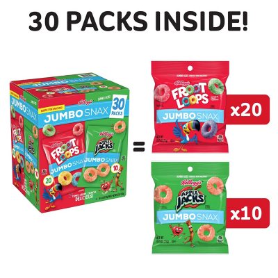 Kellogg's Apple Jacks, Breakfast Cereal, .63oz (96 Count) One cup of Kellogg's Apple Jacks Cereal contains: 10% of the recommended daily intake of fiber 25% of the recommended intake of iron, thiamin, riboflavin, niacin, and folic acid 25% of the recommended daily intake of vitamins B6, B12, and C 10% of the recommended daily intake of vitamins A and D, and zinc