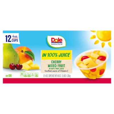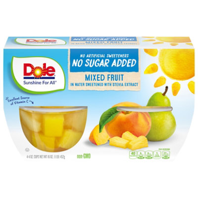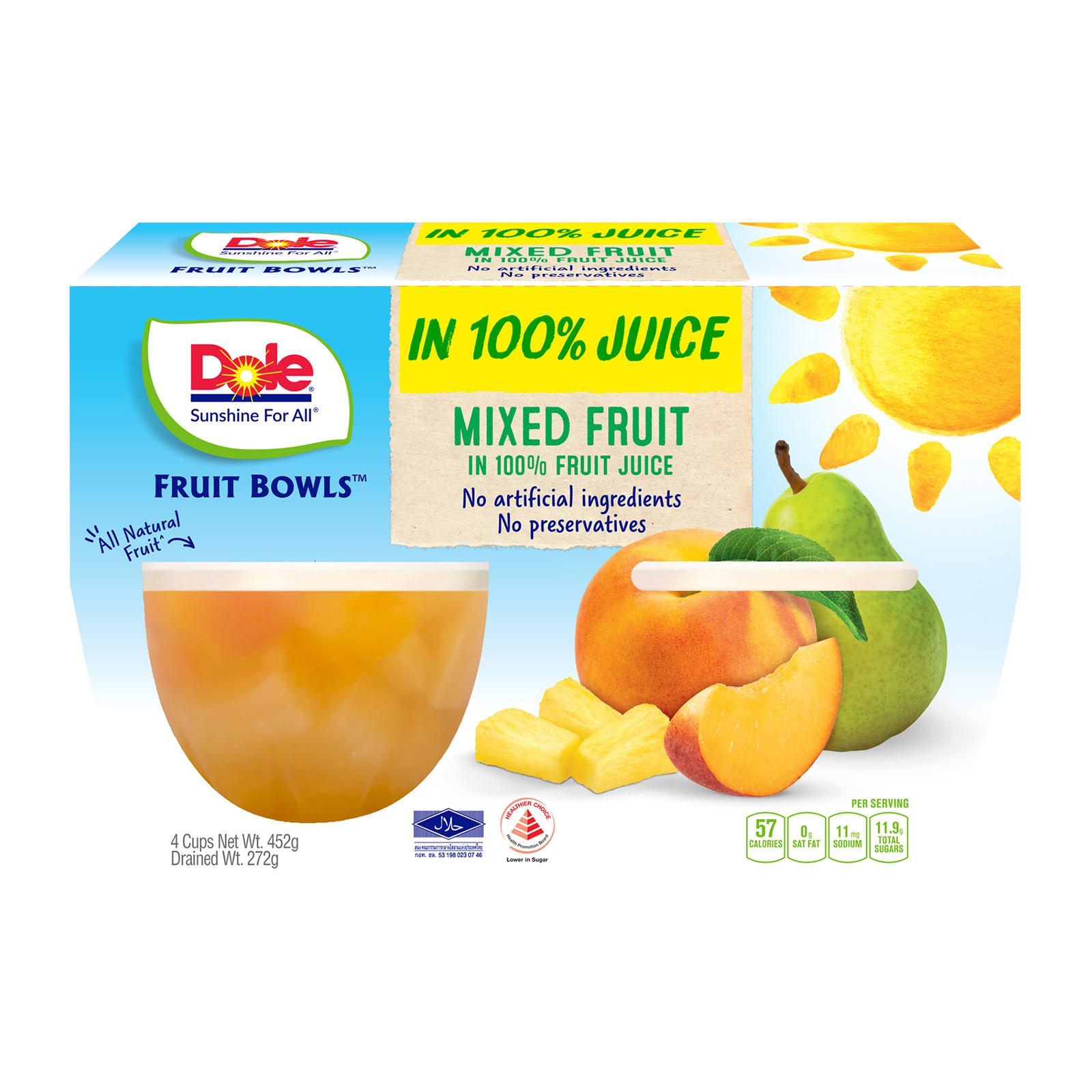 Amazon.com : DOLE FRUIT BOWLS, Dole Mixed Fruit , 4-Ounce Cups (Pack of ... While other mixed fruit cups contain fruit in syrup or with artificial sweeteners, Dole Mixed Fruit contains real fruit in real fruit juice. These refreshing treats have 80 calories, no fat and 45 percent of the recommended daily allowance of Vitamin C. Enjoy Dole Mixed Fruit in 100% juice at home, in the office or on-the-go.