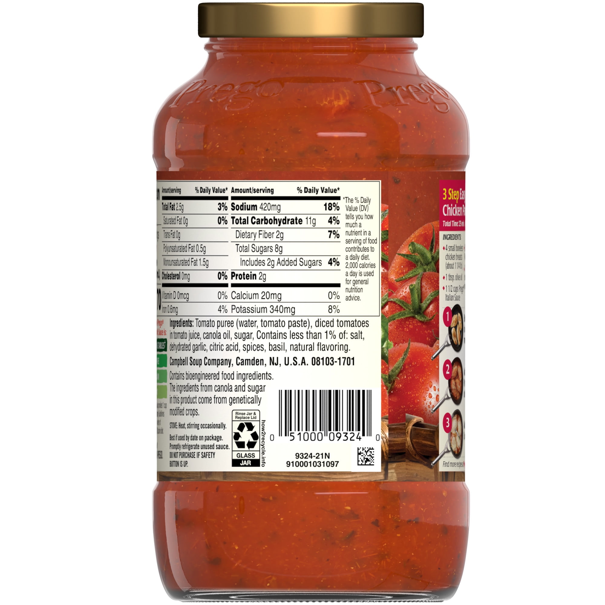 Prego spaghetti sauce nutrition label. Prego Spaghetti Sauce Nutrition Label - SauceProClub.com Spaghetti Sauce For Canning Made With Fresh Or Frozen Tomatoes. 1 Heat olive oil until hot in a pan. Stir fry minced beef or chicken until nicely browned. Next, add onion, carrot & mushrooms, and stir until fragrant. 2 Pour PREGO® Traditional pasta sauce stir and simmer for 5 minutes 3 Serve Bolognese sauce over cooked spaghetti and enjoy! Prego Traditional Pasta Sauce - Consumer Reports Features & Specs, Specs, Protein, 2, Calories, 70, Saturated fat, 0, Carbohydrates, 13, Sugars, 9, Household measure, 0.5, Sodium, 480, Total fat, 1.5, Fiber, 2, Price & Shop, More From Consumer... Prego Traditional Italian Sauce (45 Ounce, 3 Pack) - Walmart.com Nutrition facts. Refer to the product label for full dietary information, which may be available as an alternative product image. 1 Servings Per Container. Serving Size 45 Ounce, 3 Pack. ... Prego Pasta Sauce, Italian Tomato Sauce with Fresh Mushrooms, 67 Ounce Jar. 544 4.7 out of 5 Stars. 544 reviews. Pickup 3+ day shipping. Prego Lower Calorie Pasta Sauce, Traditional Italian Spaghetti Sauce ... Prego Pasta Sauce, Traditional Italian Tomato Sauce, 14 Ounce Jar. Add. $1.78. current price $1.78. 12.7 ¢/oz. Prego Pasta Sauce, Traditional Italian Tomato Sauce, 14 Ounce Jar. 3211. 4.6 out of 5 Stars. 3211 reviews. Pickup Delivery 3+ day shipping.