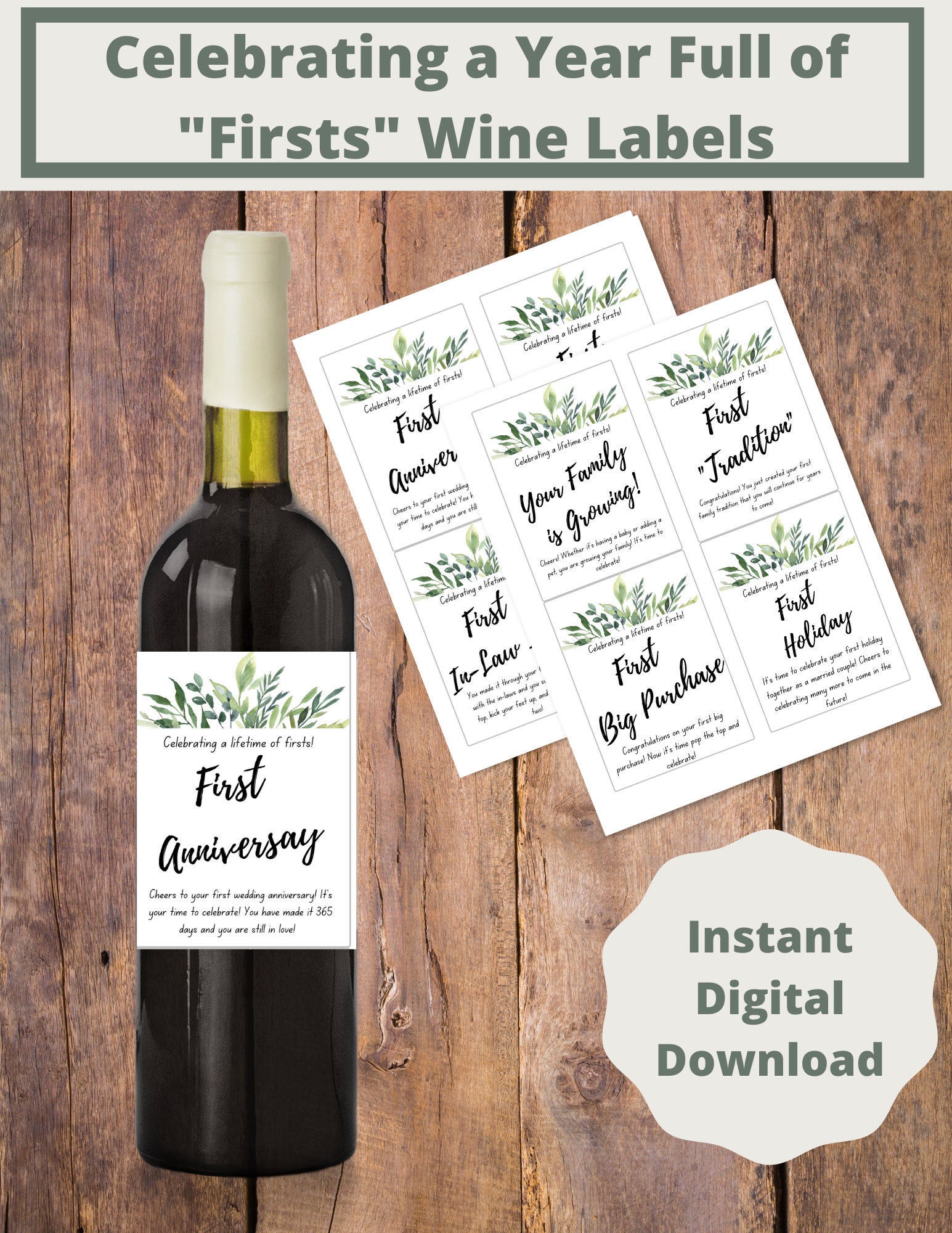 Greenery Wedding First Wine Bottle Labels, Set of 6 Waterproof Labels, Wedding Gift, Marriage Milestones, Wedding Firsts