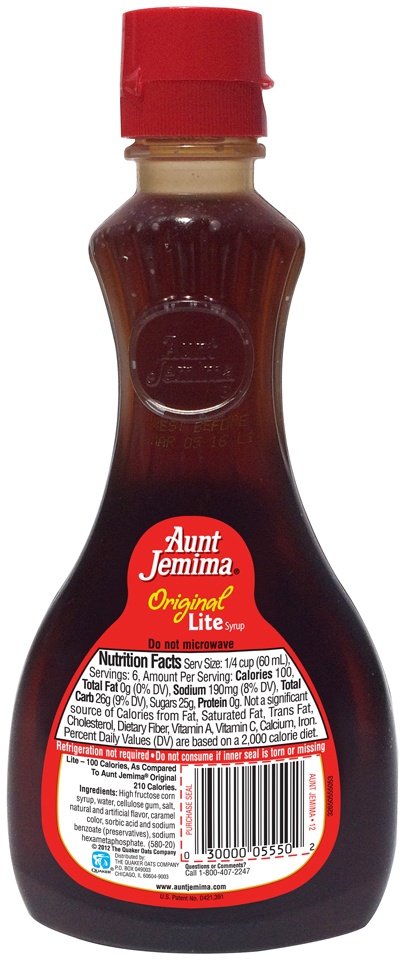 Aunt Jemima Syrup Original Lite - Stop & Shop 50 calories per serving. 50% fewer calories than Aunt Jemima original syrup. Lite-50 calories, as compared to Aunt Jemima original 100 calories per serving. We're here to help. Auntjemima.com or 800.407.2247. Please have package available when calling. Refrigeration not required. Manufacturer . QUAKER OATS . Phone . 800-407-2247 Calories in Lite Syrup - Calorie, Fat, Carb, Fiber, & Protein Info Other Searches: Calories, Fat, Protein, Fiber, & Carbs In Aunt Jemima Lite Syrup; Calories, Fat, Protein, Fiber, & Carbs In Nothing But Noodles Pasta-Less Bowl Shrimp Pesto Florentine Calories in Aunt Jemima Light Maple Syrup and Nutrition Facts - FatSecret There are 100 calories in 1/4 cup of Aunt Jemima Light Maple Syrup. Get full nutrition facts for other Aunt Jemima products and all your other favorite brands. Register | Sign In. Search in: ... Nutrition Facts. Serving Size: 1/4 cup: Amount Per Serving. Calories. 100 % Daily Values* Total Fat. 0.00g. 0%. Saturated Fat. 0.000g. 0%. Trans Fat ... Aunt Jemima Lite Syrup Nutrition Facts • MyFoodDiary® Nutrition information for Aunt Jemima Lite Syrup. Track calories, carbs, fat, and 18 other key nutrients. Start your food diary today!