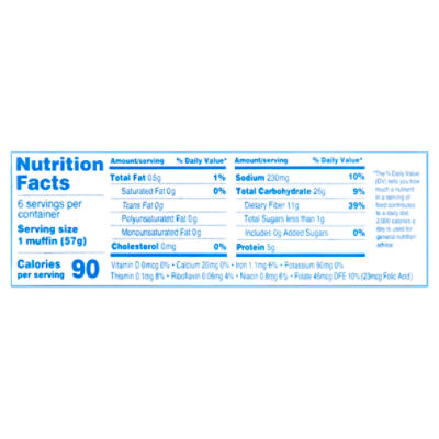 GreenWise Plain English Muffins 10 oz - Syndigo 1 English Muffin (57g) Amount Per Serving Calories 120 % Daily Value Total Fat 0.5g 1% Saturated Fat 0g 0% Trans Fat 0g Cholesterol 0mg 0% Sodium 260mg 11% Total Carbohydrates 24g 9% Dietary Fiber 1g 4% Total Sugars 1g Includes 1g Added Sugars 2% Protein 4g Vitamin D 0% Calcium 0% Iron 6% Potassium 0%