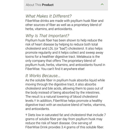 Melaleuca FiberWise Heart Healthy-Fiber Supplement-30 Servings-Net WT ... Description All-new FiberWise Drink has 12 grams of heart healthy fiber per serving, a finer blend of psyllium husk for a new, smoother texture, and two tantalizingly delicious flavors: Citrus Orange and Harvest Peach. The FDA reports that, "diets low in saturated... TOP QUESTIONS See All Does it have a chalky taste? 1 answer