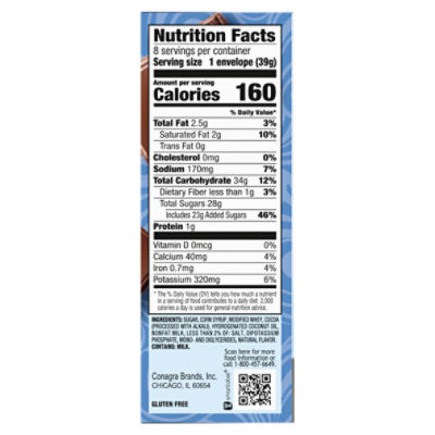 Swiss Miss Ingredients - Pastry Chef Online The following is the list of ingredients in a 1 oz, individual package of Swiss Miss Milk Chocolate Flavor Hot Cocoa Mix (found here ): Ingredients: sugar, modified whey, cocoa (processed with alkali), hydrogenated coconut oil, nonfat milk, calcium carbonate, less than 2% of: salt, dipotassium phosphate, mono- and diglyderides, artificial flavor, … Nutrition Facts for Hot Chocolate, Swiss Miss and Cocoa Powder | livestrong Swiss Miss (1 serving) 40. 0. 6 g. 6 g. 3 g. Cocoa Powder (1 tbsp) 12. 0.7 g. 3.1 g. 0.1 g. 1.1 g. Source: USDA, Swiss Miss Hot Chocolate Nutrition Info. Different brands of hot chocolate will vary at least slightly in terms of their calories, fat, sugar and carbohydrates. The type of milk (or water) you use will also affect the hot chocolate's ... What Are the Ingredients in Swiss Miss Hot Chocolate [Updated] Swiss Miss Hot Chocolate contains sugar, corn syrup, modified whey, cocoa (processed with alkali), hydrogenated coconut oil, nonfat milk, and less than 2% of salt. As a result, Swiss Miss Hot Chocolate is high in sugar and calories. Some people may find Swiss Miss Hot Chocolate to be too sweet.