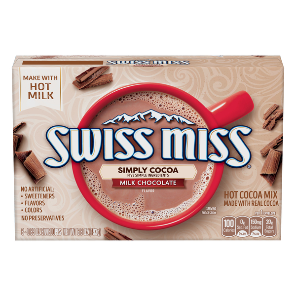 What Are the Ingredients in Swiss Miss Hot Chocolate [Updated] Swiss Miss Hot Chocolate contains sugar, corn syrup, modified whey, cocoa (processed with alkali), hydrogenated coconut oil, nonfat milk, and less than 2% of salt. As a result, Swiss Miss Hot Chocolate is high in sugar and calories. Some people may find Swiss Miss Hot Chocolate to be too sweet. Nutrition Facts for Hot Chocolate, Swiss Miss and Cocoa Powder | livestrong Swiss Miss (1 serving) 40. 0. 6 g. 6 g. 3 g. Cocoa Powder (1 tbsp) 12. 0.7 g. 3.1 g. 0.1 g. 1.1 g. Source: USDA, Swiss Miss Hot Chocolate Nutrition Info. Different brands of hot chocolate will vary at least slightly in terms of their calories, fat, sugar and carbohydrates. The type of milk (or water) you use will also affect the hot chocolate's ... Swiss Miss Ingredients - Pastry Chef Online The following is the list of ingredients in a 1 oz, individual package of Swiss Miss Milk Chocolate Flavor Hot Cocoa Mix (found here ): Ingredients: sugar, modified whey, cocoa (processed with alkali), hydrogenated coconut oil, nonfat milk, calcium carbonate, less than 2% of: salt, dipotassium phosphate, mono- and diglyderides, artificial flavor, …