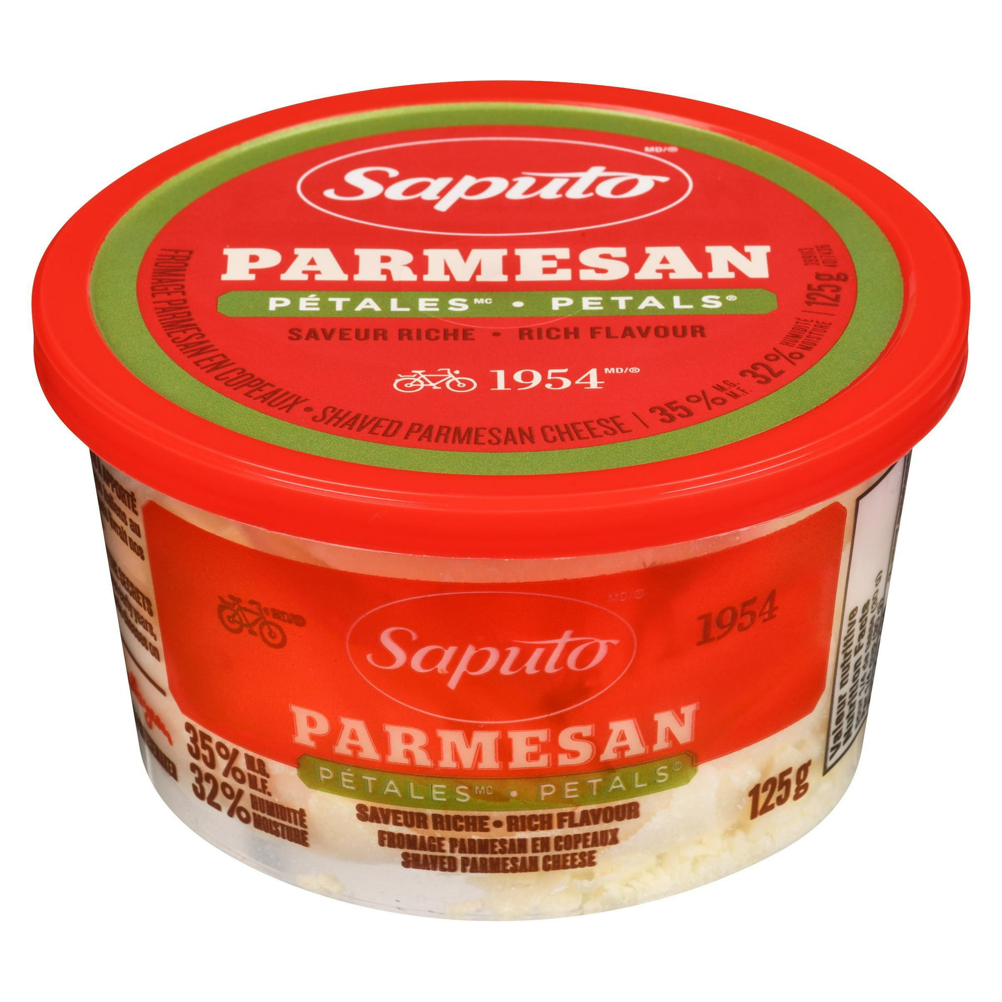 Saputo Parmesan Cheese Petals 125g - The Saputo Fridge Saputo Parmesan Cheese Petals 125g $5.00 $5.55 Add to Cart Pasta's favourite cheese. Our classic, Canadian-made Parmesan cheese is conveniently shaved into petals for easy use in your recipes. Ingredients: Pasteurized Milk, Salt, Bacterial Culture, Calcium Chloride, Microbial Enzyme, Lipase, Cellulose, Natamycin. Product code: 433113